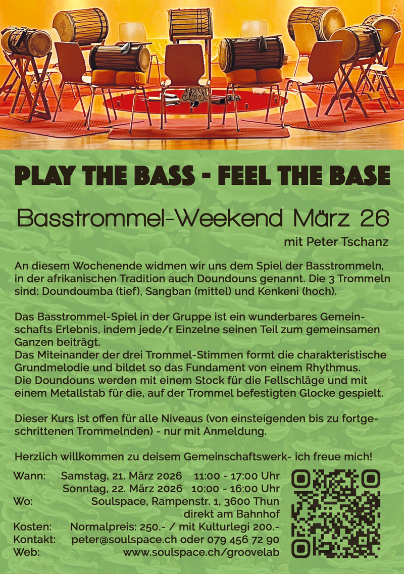 Ich freue mich sehr, an diesem Wochenende zum 2. Mal ausschliesslich in die Welt der Doundoums – den Basstrommeln, einzutauchen. Die Trommeln, Doundoumba, Sangban und Kenkeni, bilden das rhythmische Fundament der afrikanischen Grooves und werden meistens kombiniert mit den Djembes gespielt – an diesem Wochenende erhalten sie aber die volle Aufmerksamkeit;-)